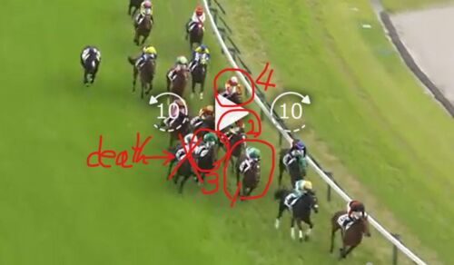 2023年日本ダービー3コーナー付近の映像(出典、JRA全周回パットロールビデオ)。 下の画像。1着馬(単勝8,3倍)。2着馬(単勝1,8断然人気)。 3着馬(単勝25,6。6番人気。複勝3,8) >×印心肺停止入線後死亡⇒スキルヴィングC.ルメール2番人気。…